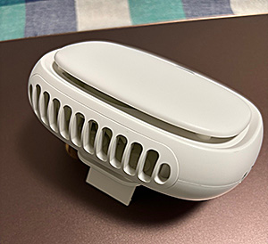 上向きに腰のあたりにつけて使うものだけど卓上用にもなる。